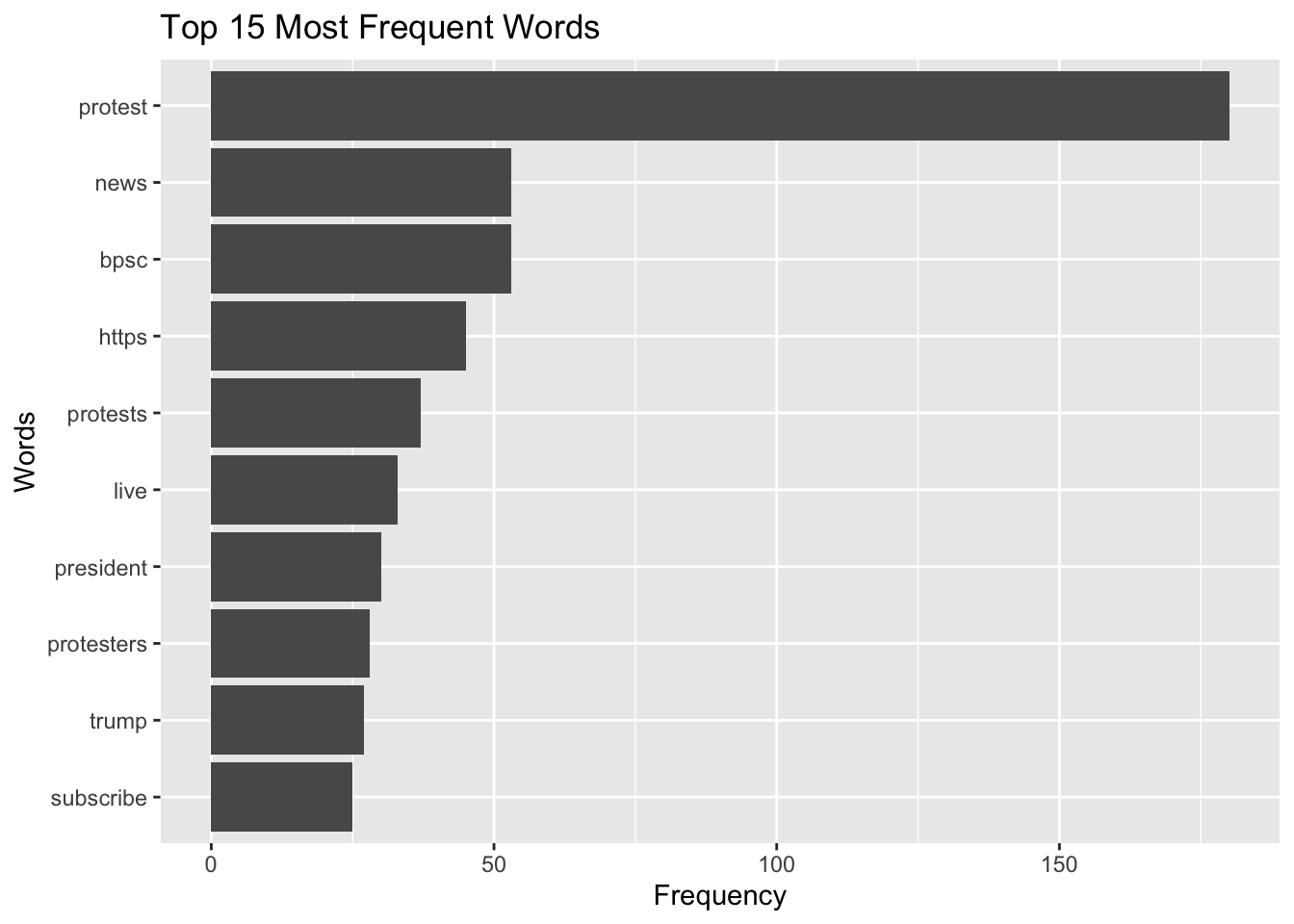 Here, I selected top 15 words. If you don’t specify a number or use this function, the graph will include the entire dataset, which may be difficult to interpret.